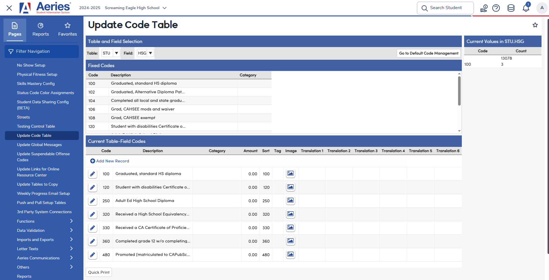 The Update Code Table is found within School Info | Configurations in the navigation menu. The Update Code Table is used to maintain available codes that are used for selection in various fields on forms throughout Aeries, such as the Student Data form. A Fixed Code section is available that identifies all fixed codes that apply to the selected Table and field.