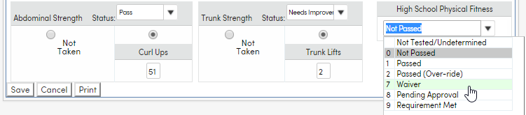 When a student has passed the Physical Fitness test, Passed will print under the Status column. This is the Overall Status for all tests taken. The number of Tests Passed will also display. Each category will display if they passed or didn’t pass. If a student passed the category a P (20##) will display which indicates the year the category was passed.