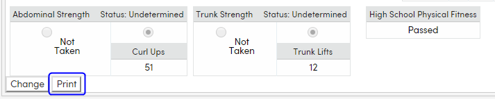 Individual physical fitness records can be printed for a student from the Physical Fitness Test Results Details tab. Use the Search to display the student and click on the Print button.