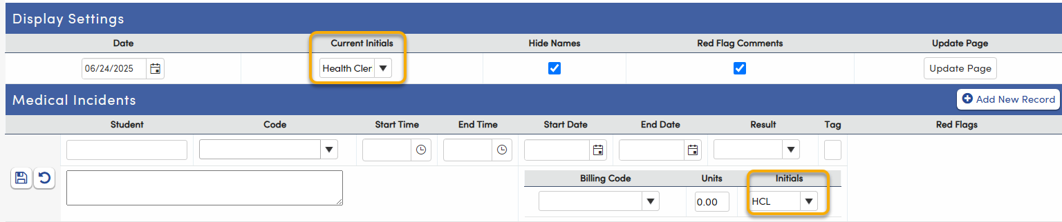 The Daily Medical Log has a Current Initials Field. This field displays the last used Initials used to log an entry with. To select a different set of Initials to log an entry, click the mouse on the dropdown arrow and select from the list. When a new record is added, the selected Initials will populate automatically under the Initials field.