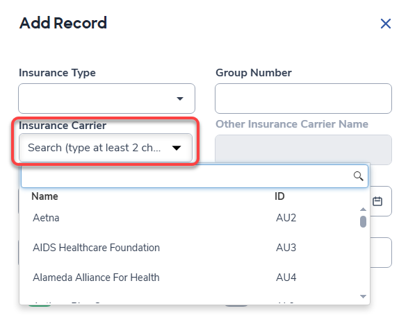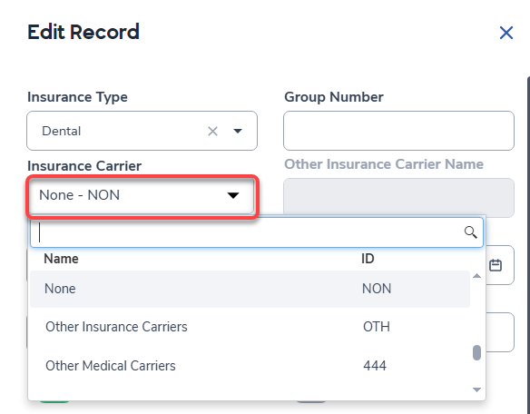 When a carrier is selected, the code is populated in the Insurance Carrier Code field (MII.ICC) and the Insurance Carrier name is displayed in that field, and also in the Insurance card header for that record.