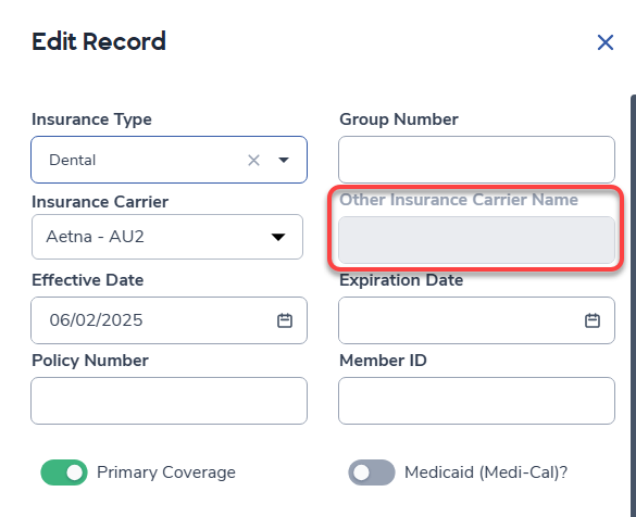For cases where the insurance carrier is not on the list, parents can select Other-OTH. The Other Insurance Carrier Name field will be greyed out by default. The Other Insurance Carrier Name field will become enabled once Other-OTH is selected under Insurance Carrier dropdown. The 'other IC name' field (MII.NM) will store the text entered as it is populated.