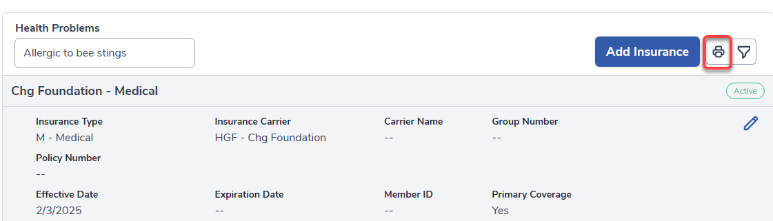 A report can be printed by selecting the Print Icon on the Insurance Info page for a student.