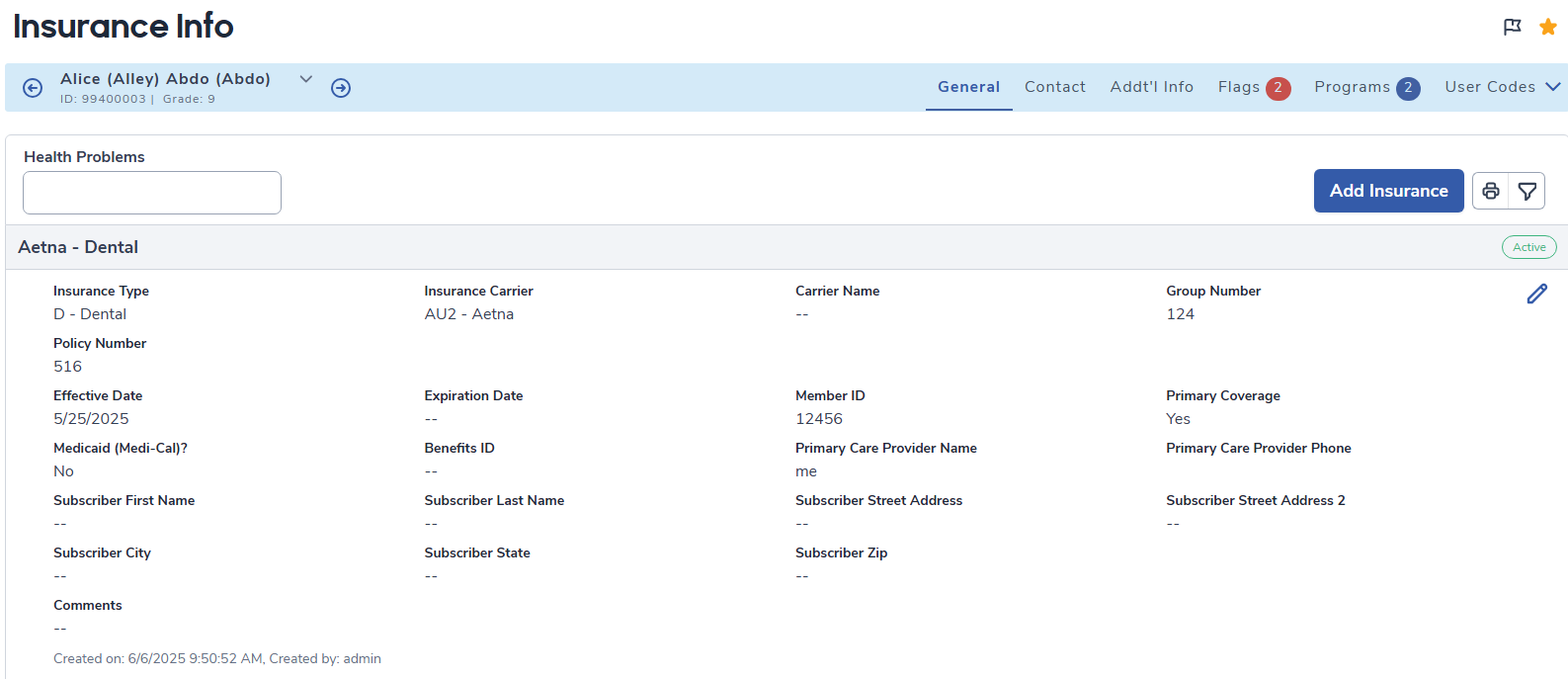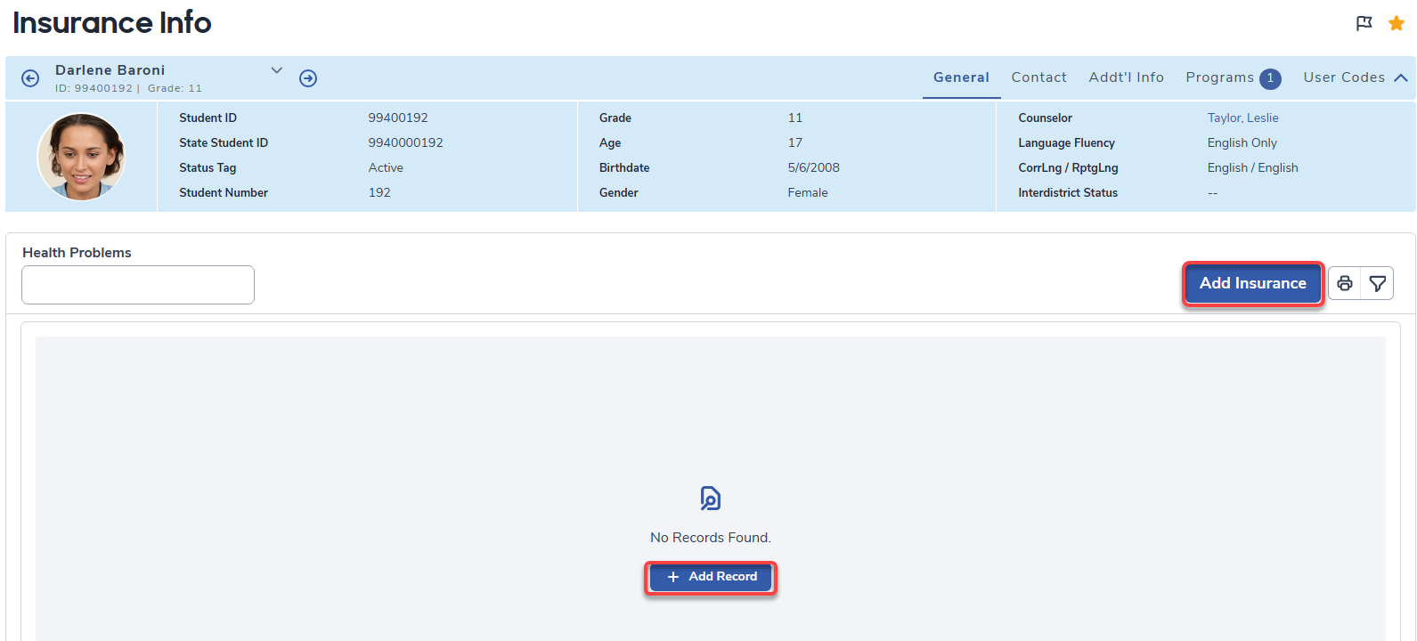 To add Insurance Information for a student, click the mouse on the Add Insurance button in the header, or if there are no existing Insurance records, the Add Record button in the middle of the card.