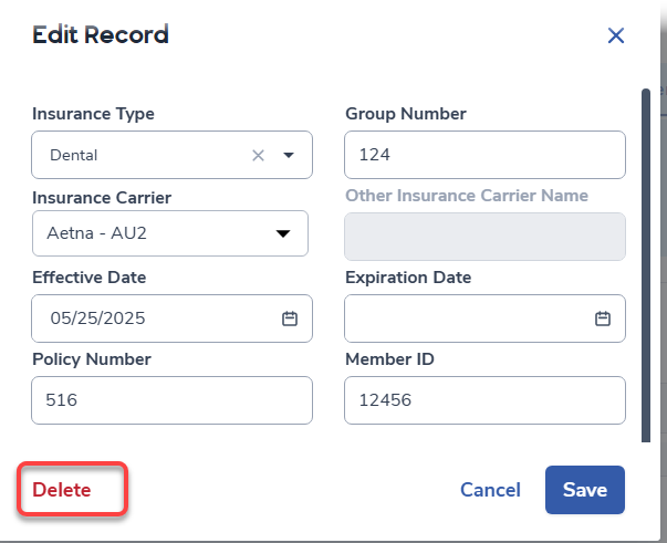 To delete a record, while in edit mode, click on the Delete icon in the bottom left corner.
