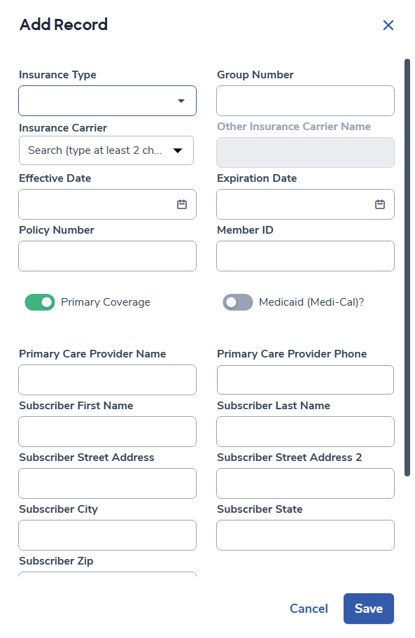 A window will display with several fields to store Insurance information, subcriber information and effective dates.