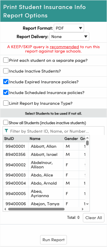 Multiple students can be printed by navigating to View All Reports > Student Insurance Info Report. The report is available from District or School.