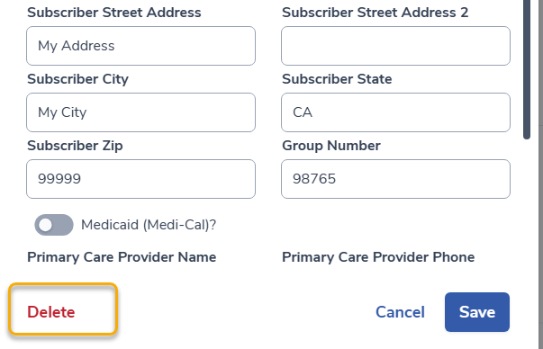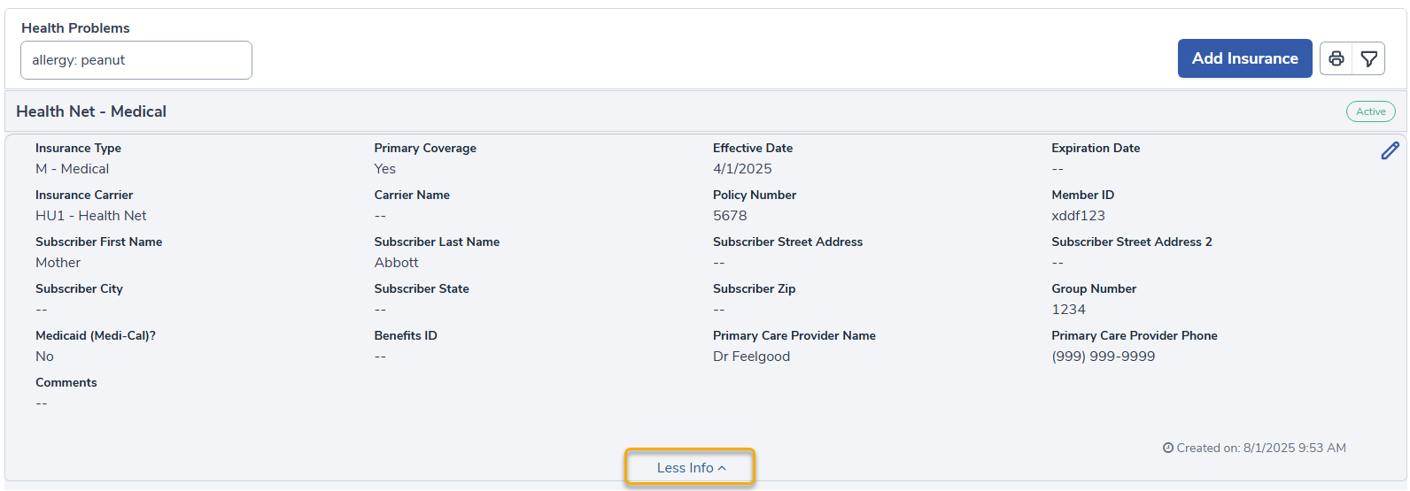 A window will display with several fields to store Insurance information, subcriber information and effective dates.