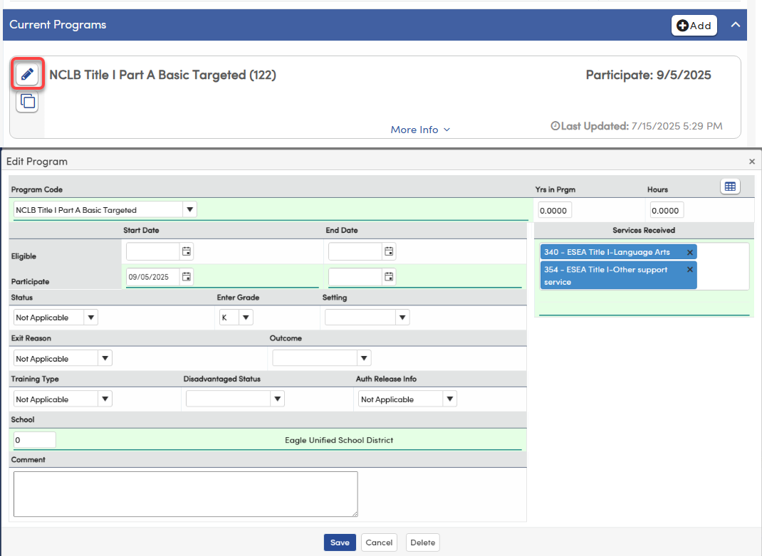 | Participation End Date/ Eligibility End Date | PGM.PED PGM.EED | 03.16 | Education Program Membership End Date | Eligibility End Date can also be extracted for certain programs |