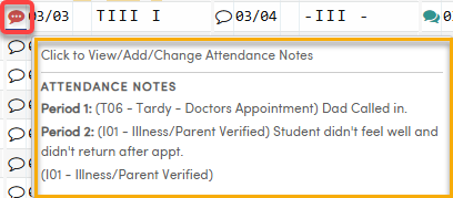 Hovering over an attendance note icon displays a tooltip showing a preview of the attendance notes for that date. The tooltip displays the period, attendance note code with description, and comment text, and is supported for Flex, Period, and Daily attendance. The tooltip is read-only; clicking the icon continues to open the full Attendance Notes modal. After closing the modal, the tooltip is refreshed to reflect any changes made to the Attendance Notes.