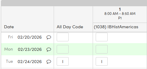 The Callout next to the date selected on the Attendance form will now display in red. If a callout displays in green, it means an ADA Make-up code was added to this record.