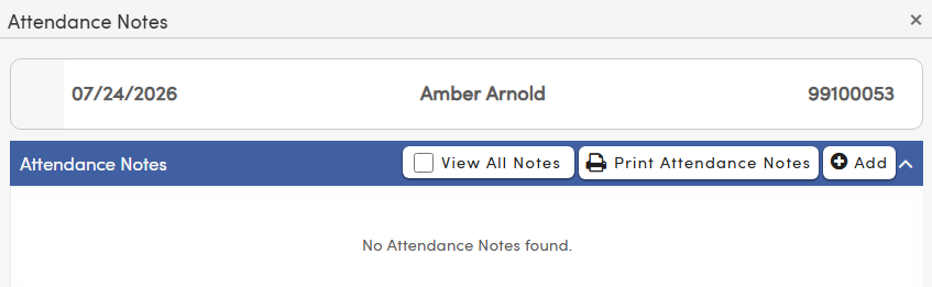 The following form will display. At the top of the form the attendance date, student name and ID number will display. Any previous notes added for the date selected will also display. To add Attendance Notes, click the Add button located on the right-hand side of the form.