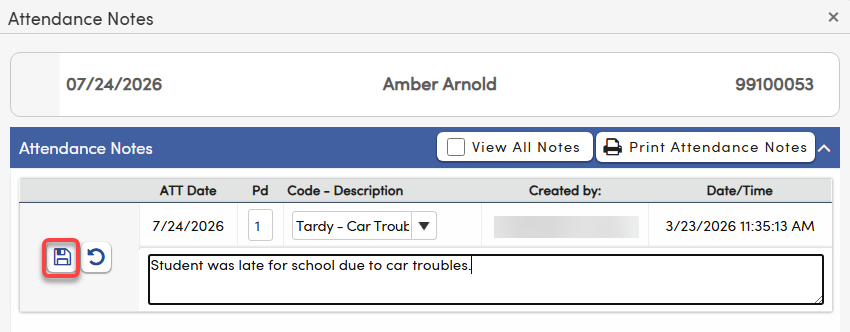 When finished entering the Attendance Note, click the Save icon and the record will be added.