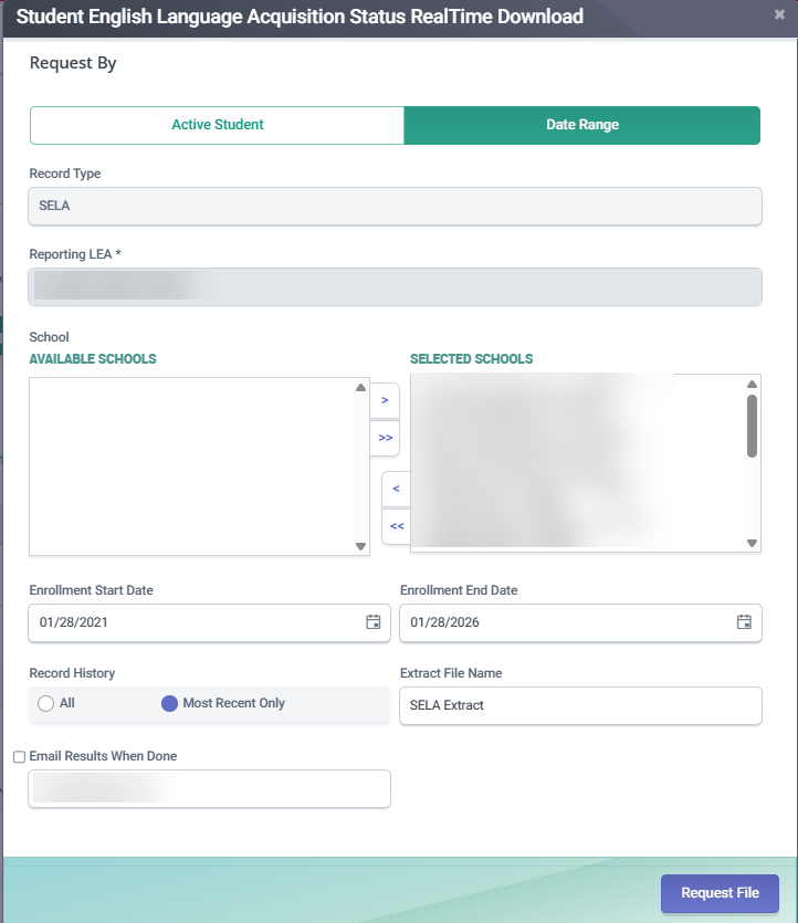 - Extracts > RealTime Extracts tab > Select record Type of Student English Language Acquisition Status Download - SELA
