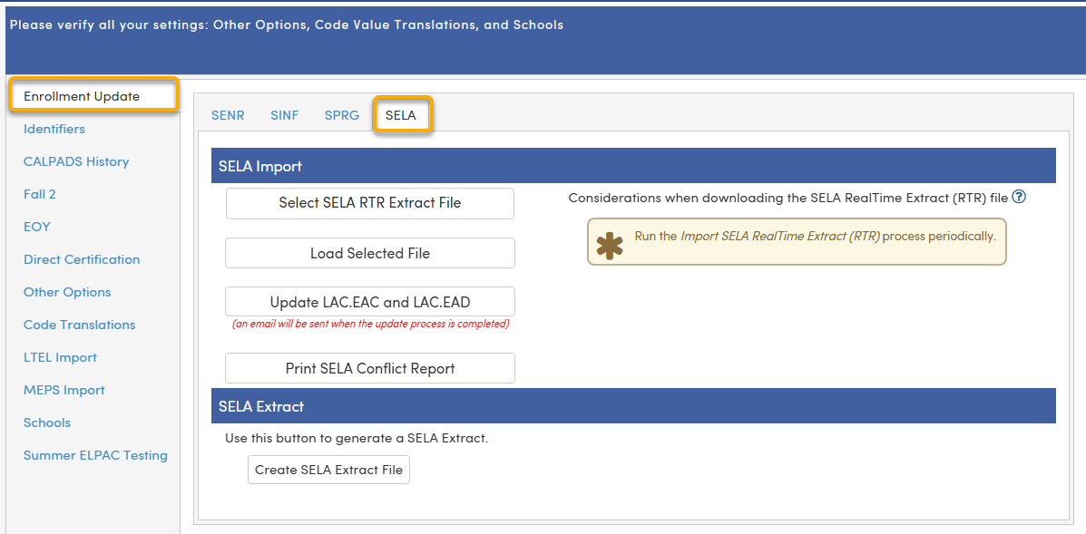 3. In Aeries, on the CALPADS Extracts form, Enrollment Update, SELA tab: