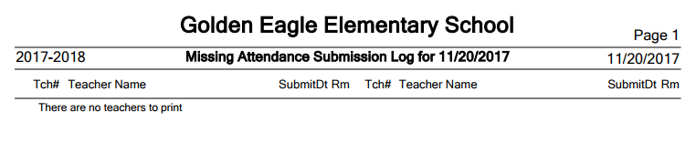 When unselecting the Show Only Missing Attendance Submissions option, the Attendance Submission Log report will print with submission data and will include the date timestamp of the submitted attendance based on the log data from ASL or CAS.