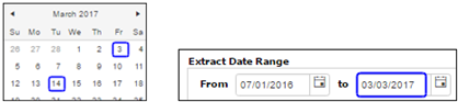 NOTE: If a district calendar does not exist the default Extract Date Range will be 7/1 of the current school year through 10 days prior to the current date. Weekends will be included in the 10-day count, but if the 10th day is a Saturday or Sunday, the prior Friday will be used as the “to” date. For example, if the current date is 3/14/2017, then 10 days prior is 3/4/2017. Since 3/4/2017 falls on a weekend, 3/3/2017 will be used as the default “to” date.