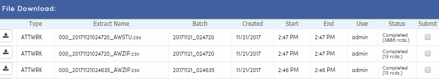 The File Download section of the screen displays information about the extracts while they are processing and provides a link to the extract files once they are complete. The extracts’ reference location (not the extract itself) are stored in the File Location Information (FLI) table.
