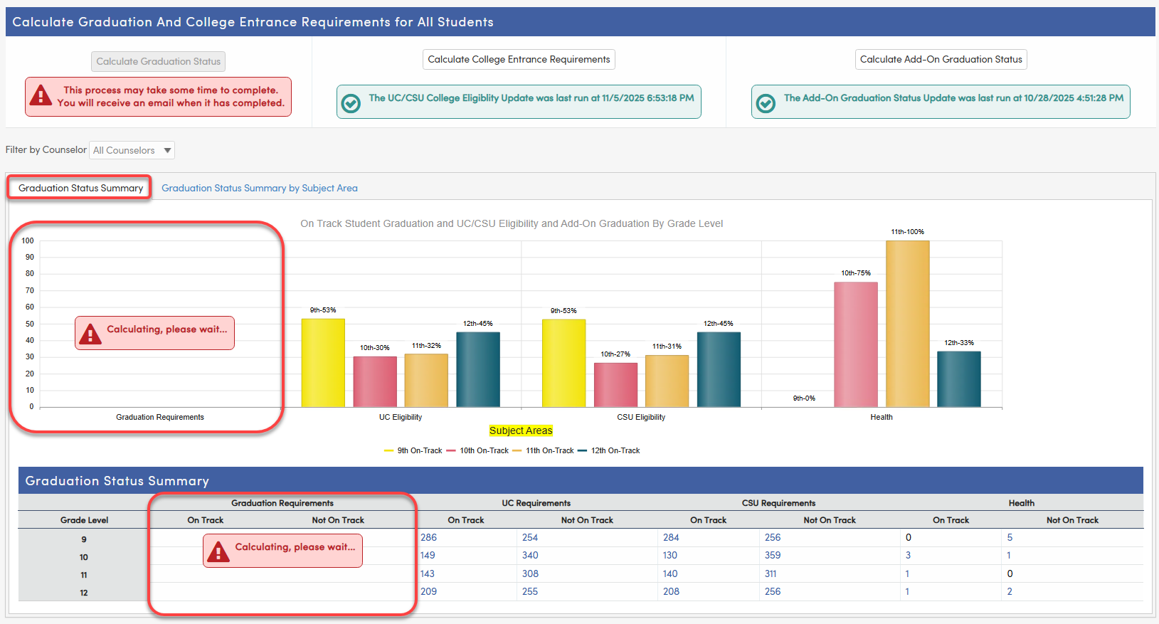 While the Graduation Status calculation process is running, the bar graphs and graduation status summary information will be replaced with a red message indicating the process is 'Calculating...please wait...'. Once the process completes, the data will be restored. Note: The same behavior will be implemented for the Calculate College Entrance Requirements (CER) in a future update.