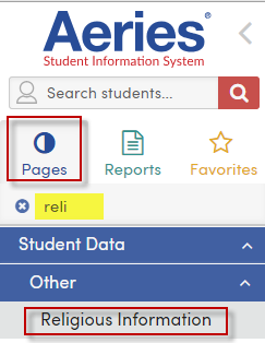 After the option to enable the page has been turned on in School Options, the Religious Information page can be accessed from the Pages navigation tree by searching for Religious Information.