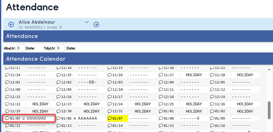 If an ADA Make-Up Code is populated in the Attendance Note, after saving it, the Attendance Note icon on the Attendance page will display in green and the All Day Column will have a green border around the original absence code.