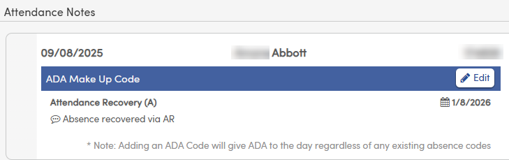 An ADA Make-Up Code, Date and Comment can be added in the Attendance Note for the student.