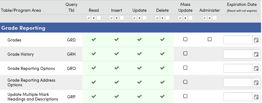 To set up Secondary Report Cards and initialize report cards for each grading term, non-admin users will need full (Read, Insert, Update and Delete) permissions to: Grades, Grade History, Grade Reporting Options, Grade Reporting Address Options and Mark Headings and Descriptions.