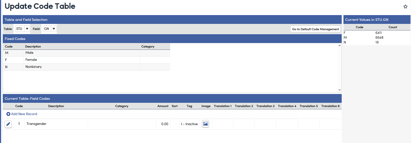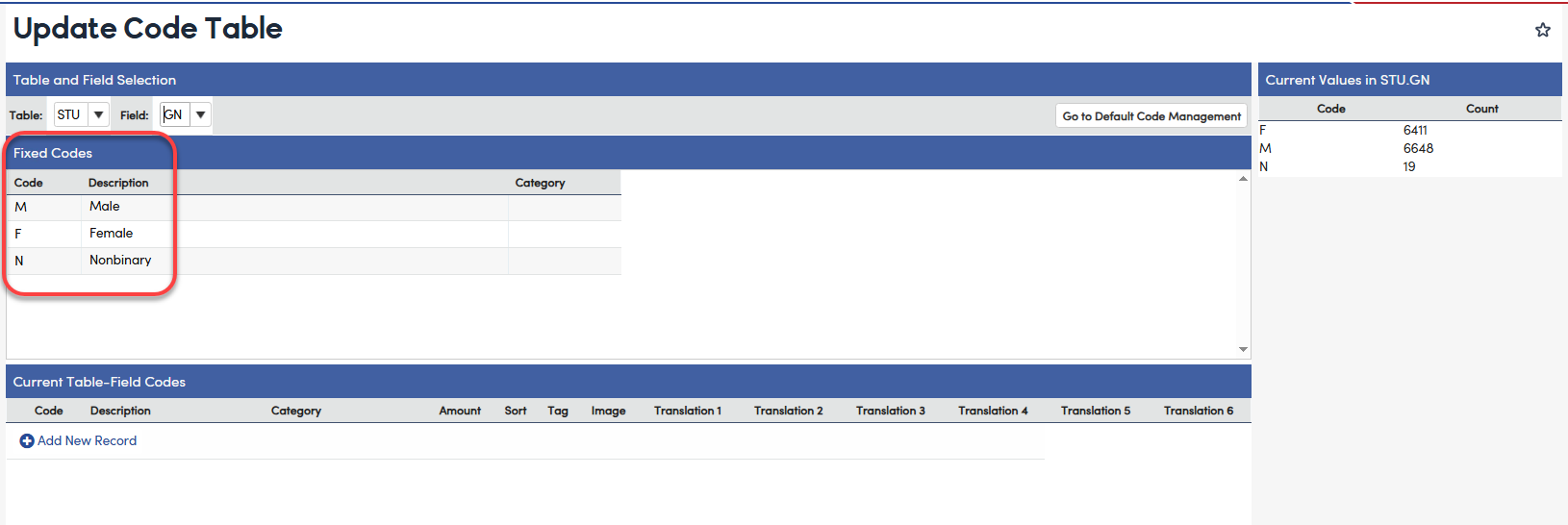The Fixed Codes for STU.GN are displayed at the top part of the form. The current gender codes assigned to students from student data are displayed on the right-hand part of the form. Districts can add records to customize their gender codes as needed. Districts can also inactivate the default hard coded gender codes added by Aeries.