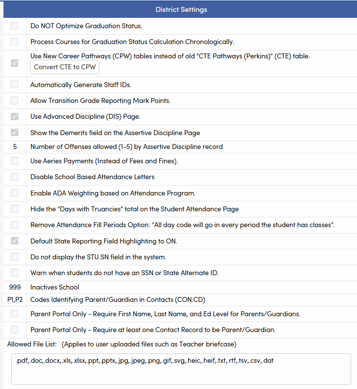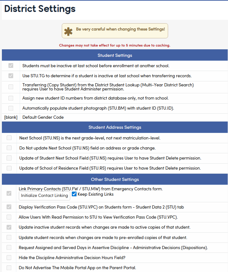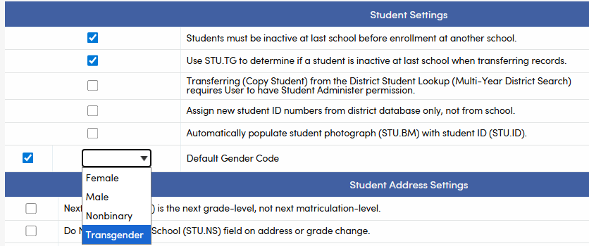 A Districts default gender can be set in the District Settings form. After navigating to School Info | District Settings in the District, the following page will display: