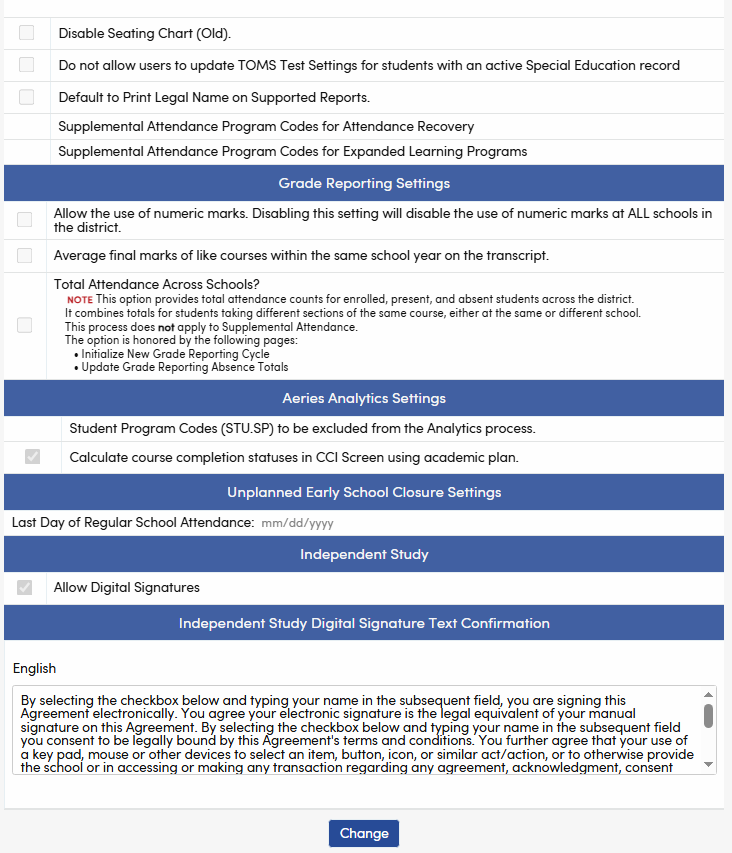 To set a Default Gender code click the “Change” button located at the bottom of the District Settings page. Place a check-mark in the Default Gender code checkbox. The gender codes previously defined in the Update Code Table form will be listed in the drop-down. Select your district's default gender code and click Save.