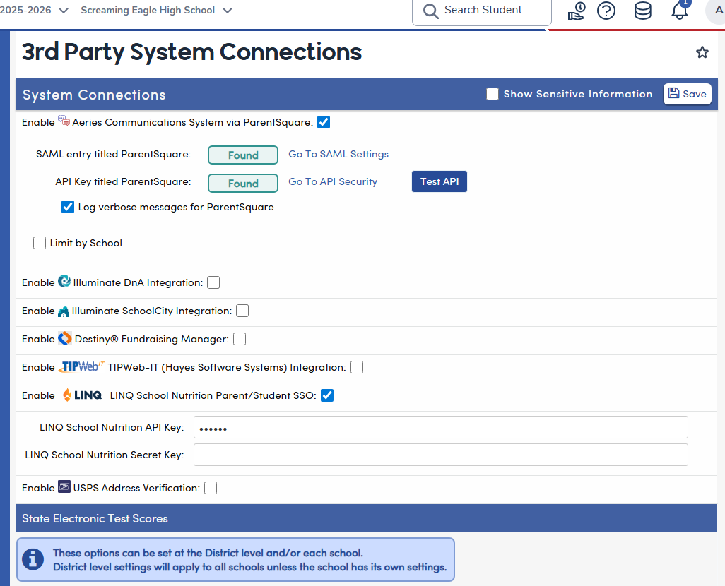 This page allows Admin users to configure and manage connections between Aeries and supported third-party systems.