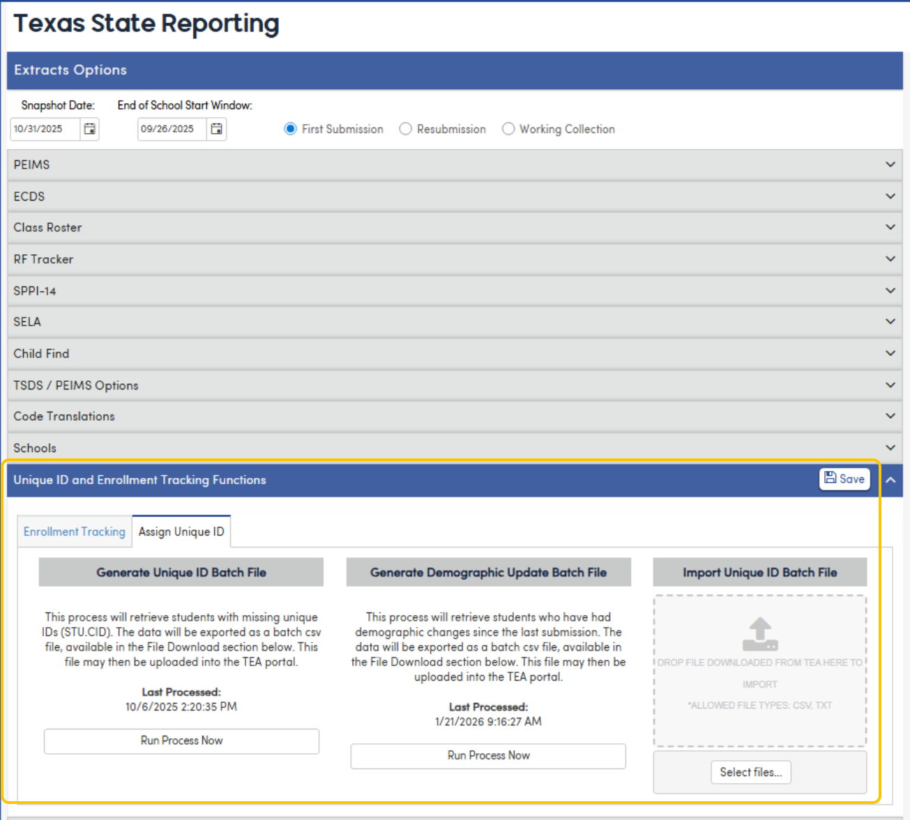 The Assign Unique ID process allows districts to create a batch file of students who do not have a Texas Unique ID. The file contains the demographic data required for Unique ID assignment which can be uploaded to the TEA TSDS portal in order to obtain Unique ID assignments for these students.