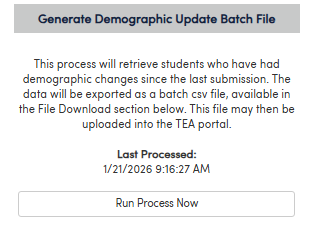 - Generate Demographic Update Batch File - Extract data in the TSDS-specified file format for student who have had changes to Race (STU.RC1 - RC5), Ethnicity (STU.ETH) or Gender (STU.GN). The most recent change in the current school year is extracted based on the Log Details (LGD) table. This file is then uploaded to the TSDS Unique ID portal to process changes to the student UID Master Records.