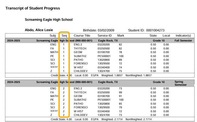 - Print Course Sequence (CRS.CSQ) - Prints the course sequence value in the CRS.CSQ field on the transcript to the left of the Course ID or Course Title. NOTE: CRS.CSQ is only populated in TX databases.