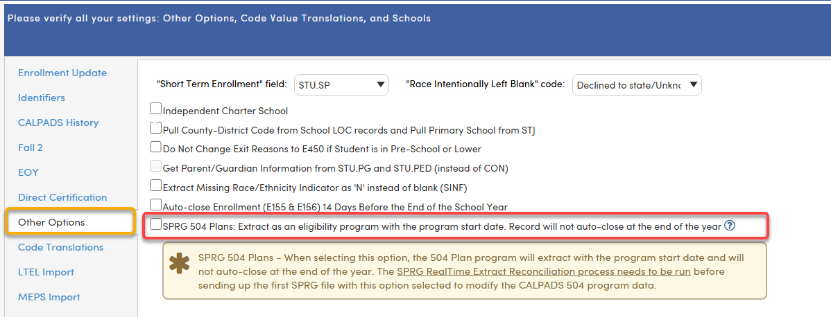 Due to the existing 504 Accommodation Plan data in CALPADS, the Aeries SPRG RealTime Extract process will need to be run when the new option is selected BEFORE sending up the first SPRG file. This is a one-time process. Once the option is selected, the records will extract as eligibility and will not be auto-closed at the end of the year.