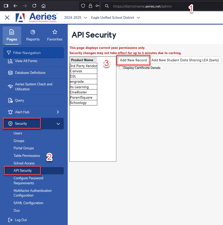 For hosted customers, your base URL will be https://yourdistrictname.aeries.net/admin