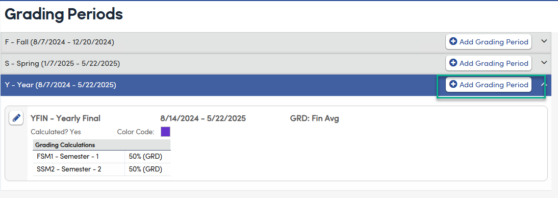A final year average of semester grades may be calculated for a final year grade mark (FYM) on the report card. The Grading Periods page contains the steps needed to create a grading period for the year and to specify the calculation. See Texas - Grading Periods.