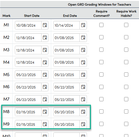 - Open GRD Grading Windows for Teachers for both the last grade mark AND the final yearly grade mark to indicate the date ranges when teachers can enter grades for the grading period.Teachers will import grades into the last mark, for example M8 2nd Semester and since the window for the final yearly mark is also open, this will automatically calculate the final yearly grade mark based on the calculation defined in the grading period on the Grading Periods page.
