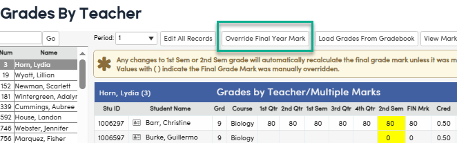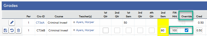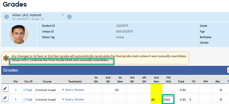 NOTE: Parents and Students will never see the notation of () that the FYM was overridden on the Grades page or Report Card.