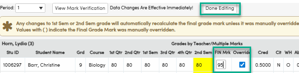 - Click Done Editing. This will save the final year mark with () around it, indicating the FYM was overridden.