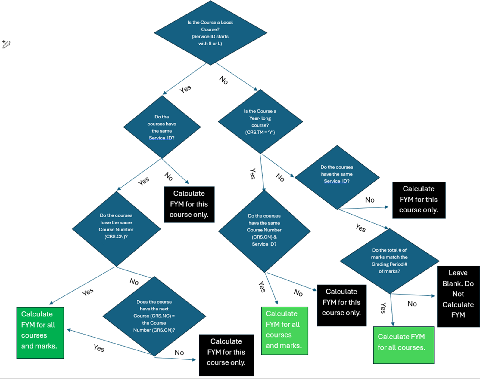 - All other courses - when the course has the same number of marks in GRD as defined in the Grading Period. For example, if the FYM Grading Period is 50% of Sem1 and 50% of Sem2, then then the FYM will only automatically calculate for 1 course with the same service id per semester at the same school on the Grades page.