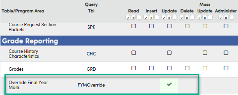 - Grant Permissions to Override the Final Year Mark to appropriate staff:Staff will need Update to the new Permissions Override Final Year Mark in order by manually enter the Final Year Mark.
