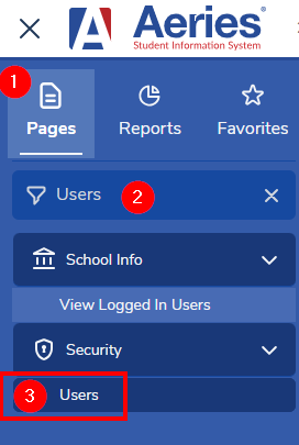 Access the Users page by clicking on the Pages Tab and filtering for Users under the Security node.
